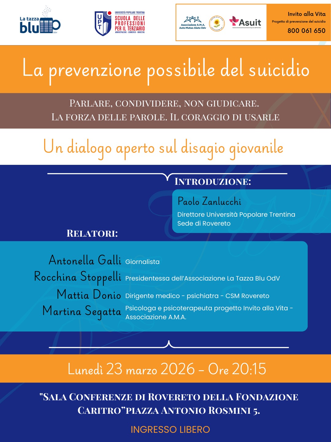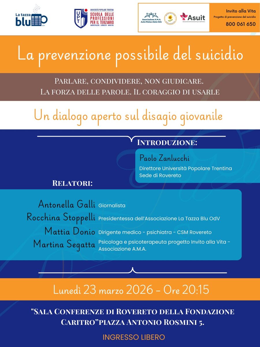 Si terrà a Rovereto l’incontro pubblico “La prevenzione possibile del suicidio – parlare, condividere, non giudicare. La forza delle parole. Il coraggio di usarle”, una serata di dialogo e sensibilizzazione dedicata al tema del disagio giovanile e della prevenzione del suicidio.