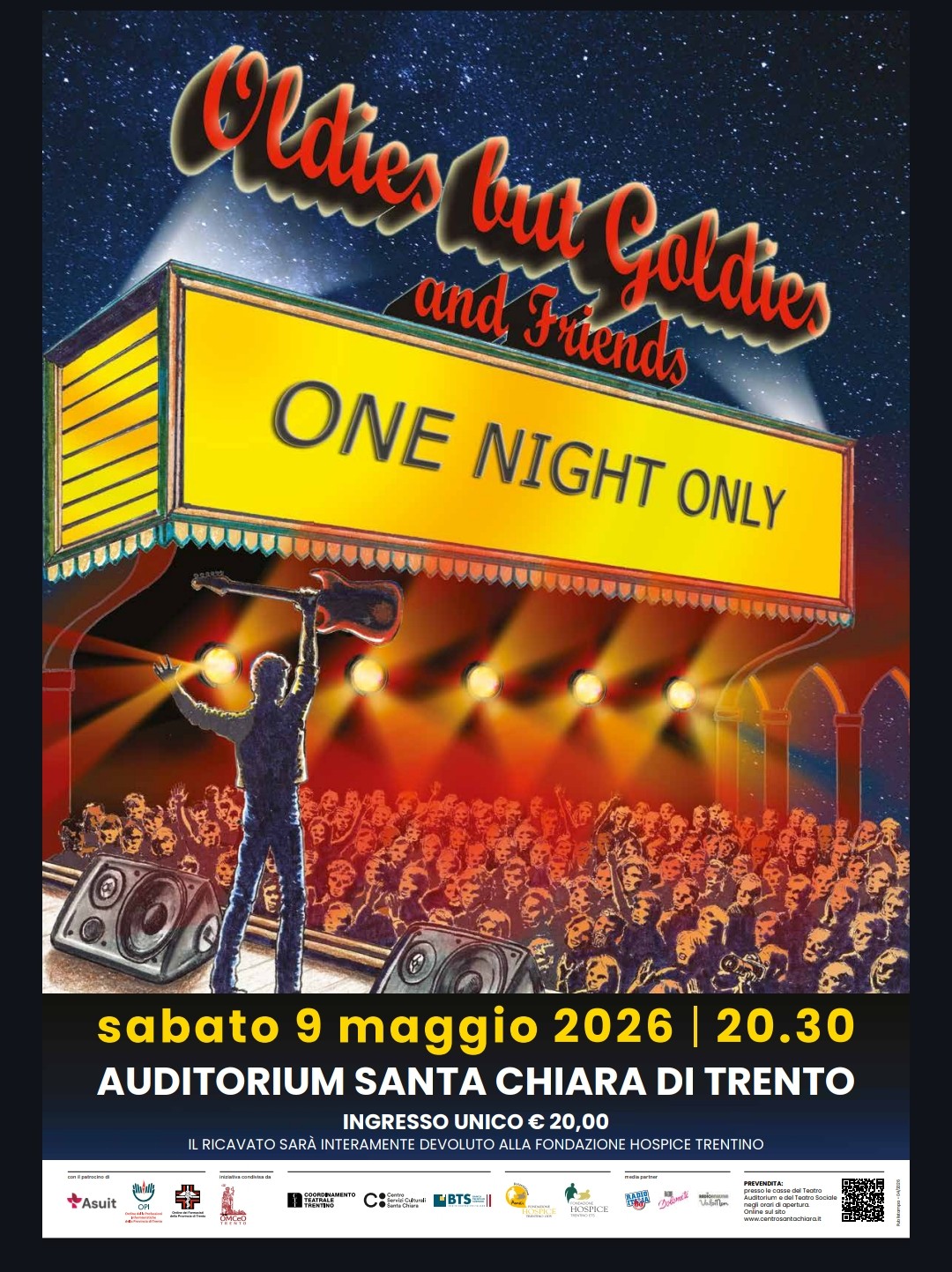 Sabato 9 maggio 2026 si terrà a Trento il concerto “Oldies but Goldies and Friends – One Night Only”, un evento musicale aperto al pubblico con finalità solidale. L’iniziativa unisce intrattenimento e impegno sociale, offrendo una serata dedicata alla musica dal vivo e alla raccolta fondi.